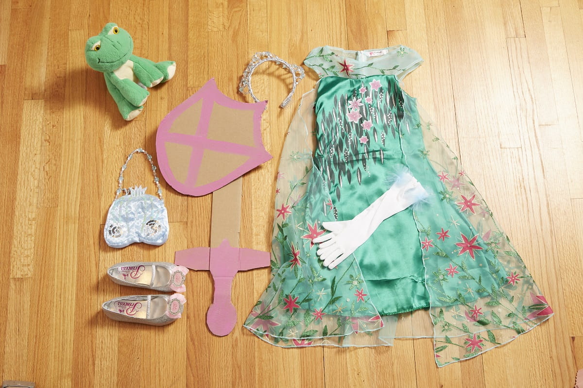 - Dress-up clothes and accessories, such as gowns and shoes, capes, crowns, jester suits, wizard hats, a knight’s armor, scepters, wands, and even dragon, frog, and fairy costumes if you’ve got them handy