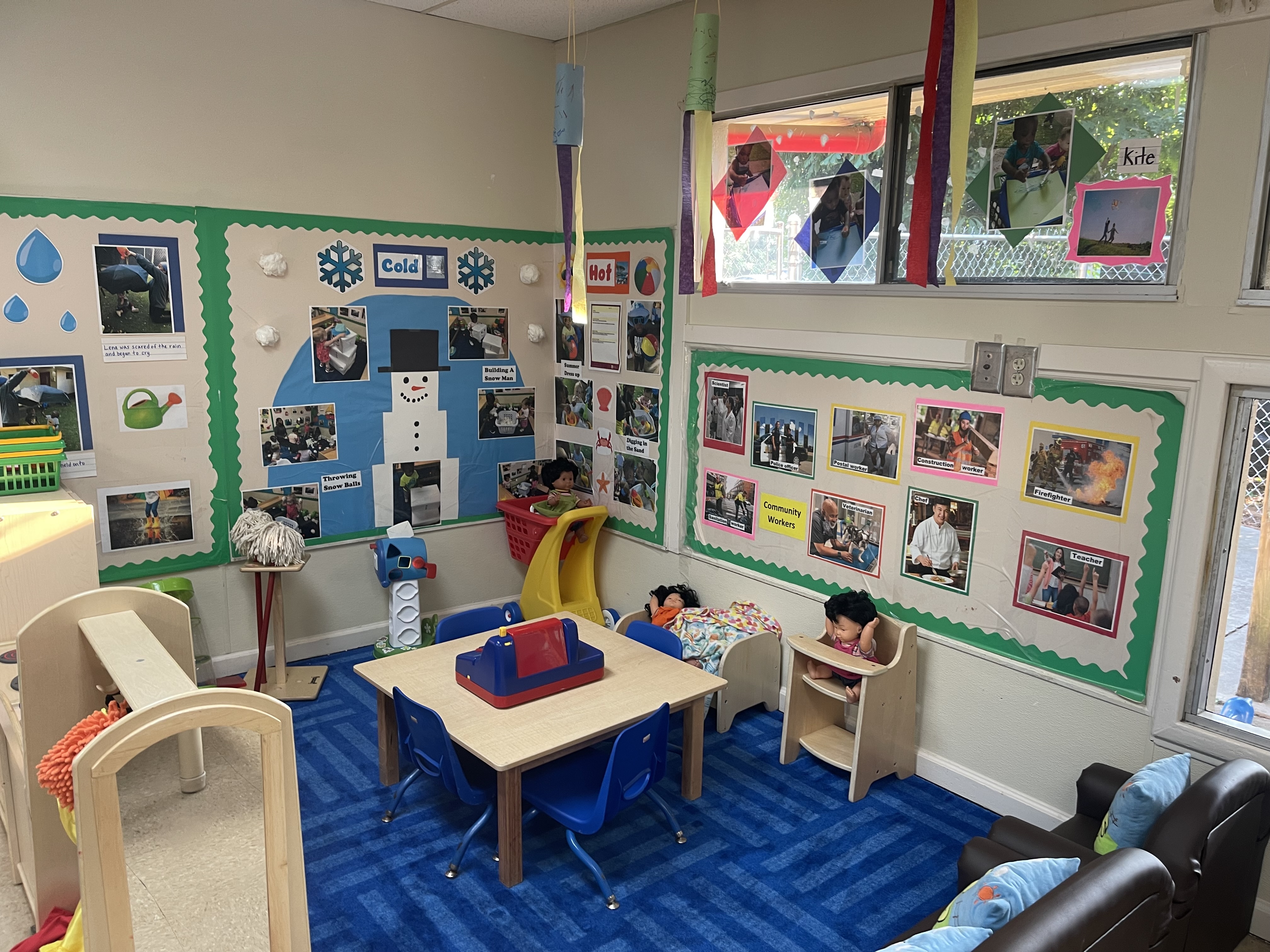 When you walk into one of our pre-K classrooms, you’ll see artwork and writing displayed around the room. Labels are everywhere to help kids connect letters with words. You’ll also see pictures on the walls that reflect the families in our community. Your child will also deepen their knowledge in language, math, science, Spanish, and social skills.